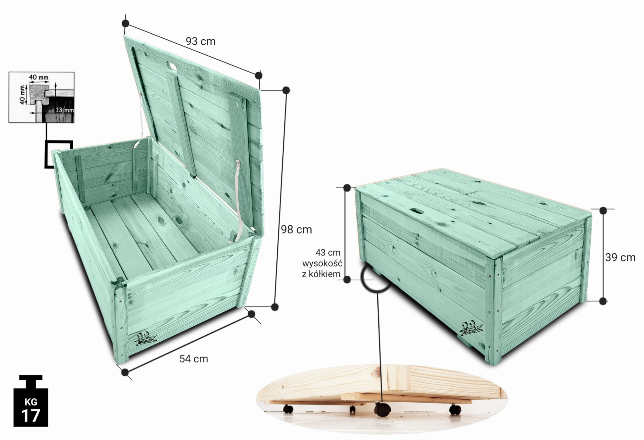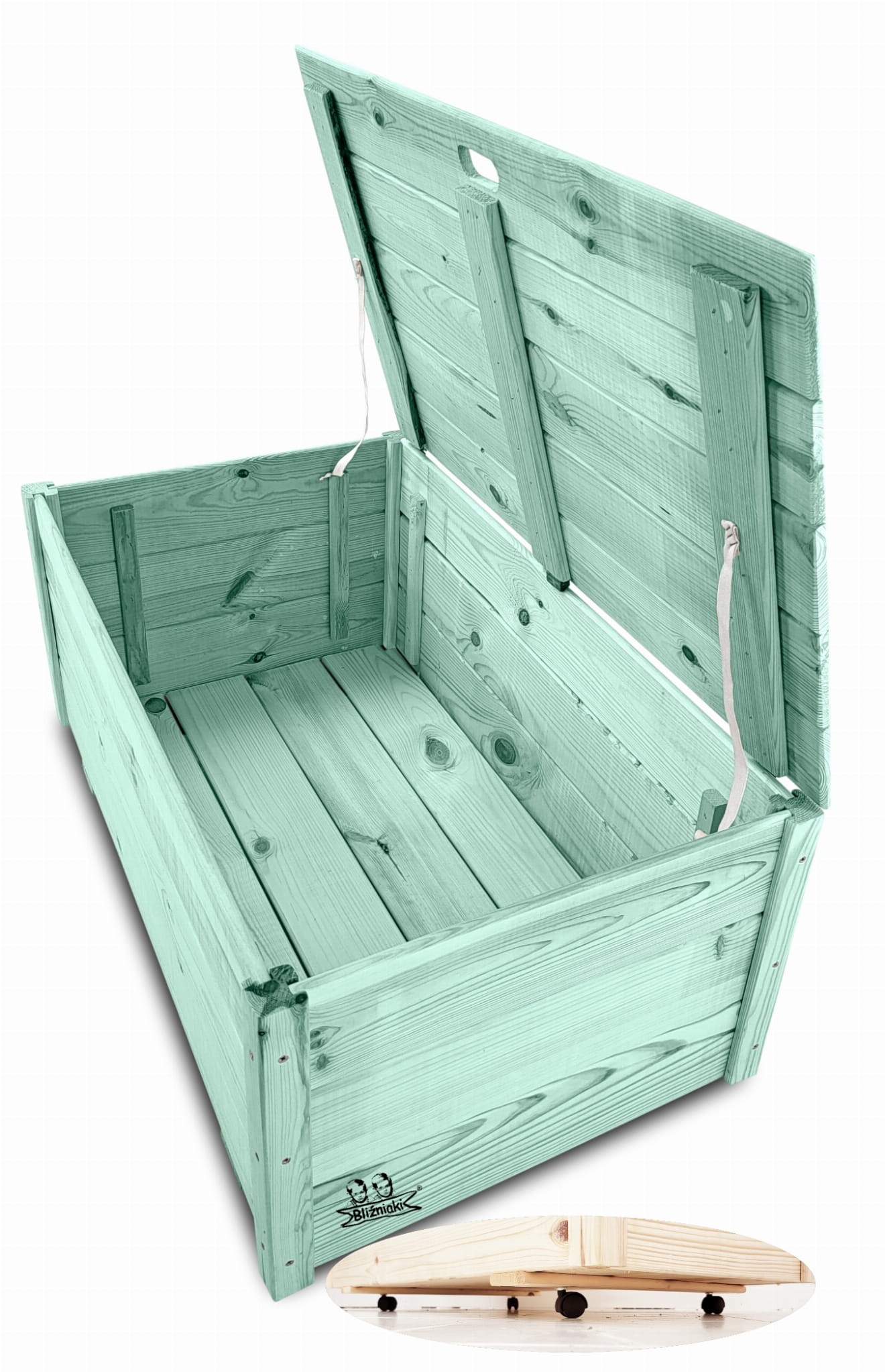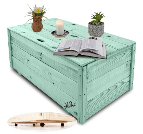 Wykonany z drewna litego, dzięki temu będzie odporny na warunki atmosferyczne i zachowuje estetyczny wygląd na dłużej. Produkt w pięknym PASTELOWO ZIELONYM kolorze. Kufer jest zaimpregnowany jednolicie zarówno od wewnątrz, jak i na zewnątrz. Dzięki temu posiada nowoczesny styl i elegancki design.