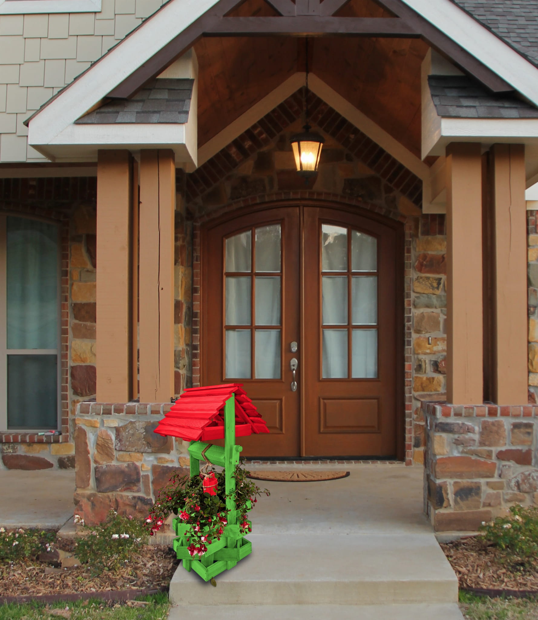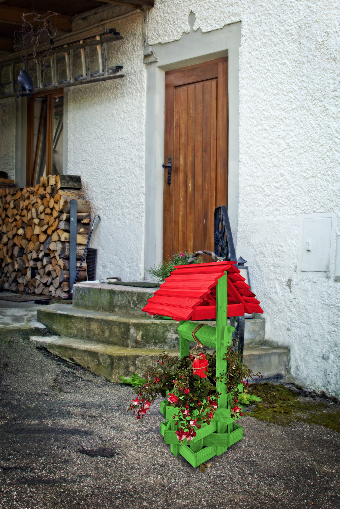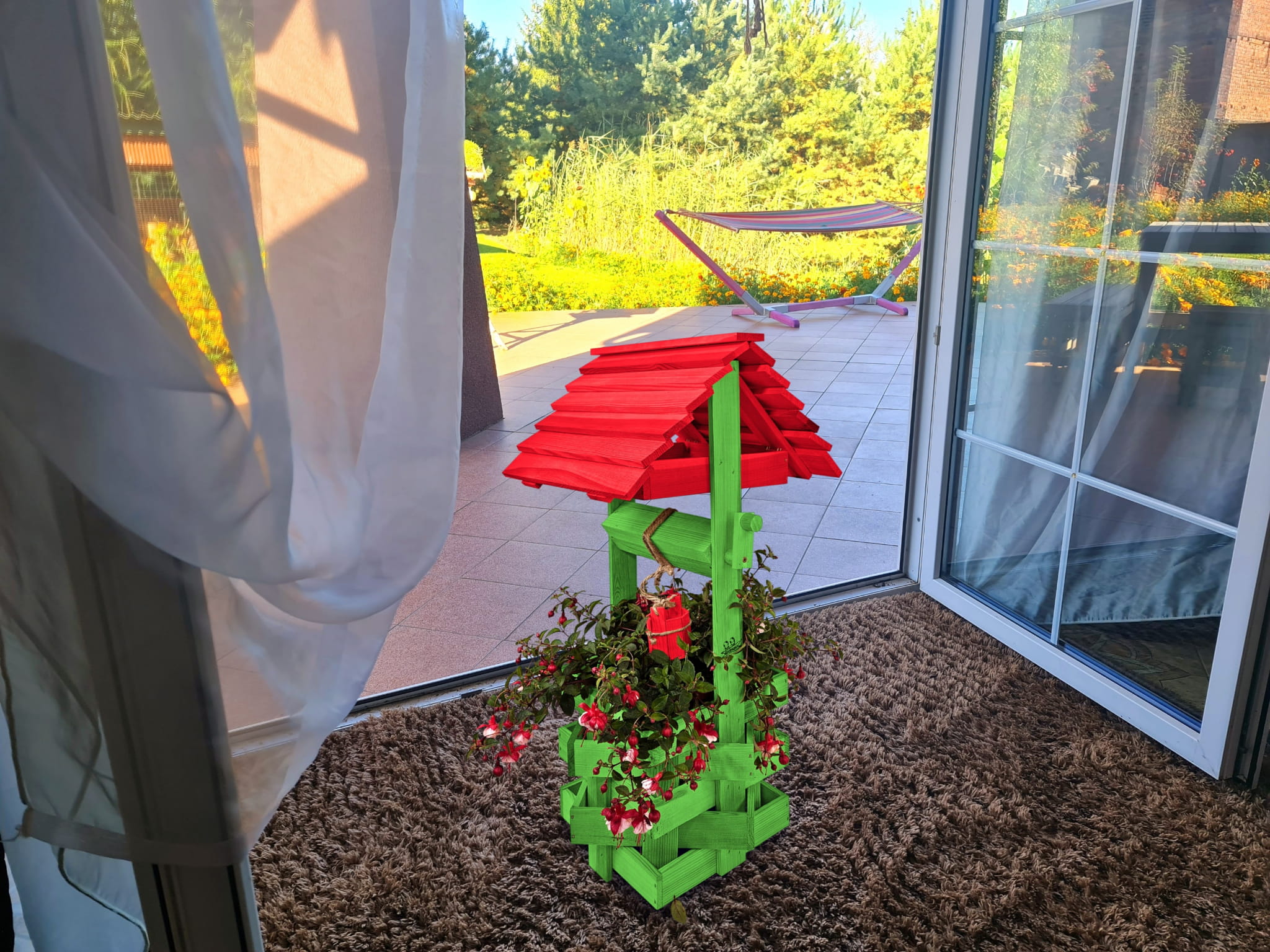 Do studni dołączona jest drewniana doniczka na kwiaty, utrzymana w tej samej estetyce, tworząc spójną i harmonijną całość.