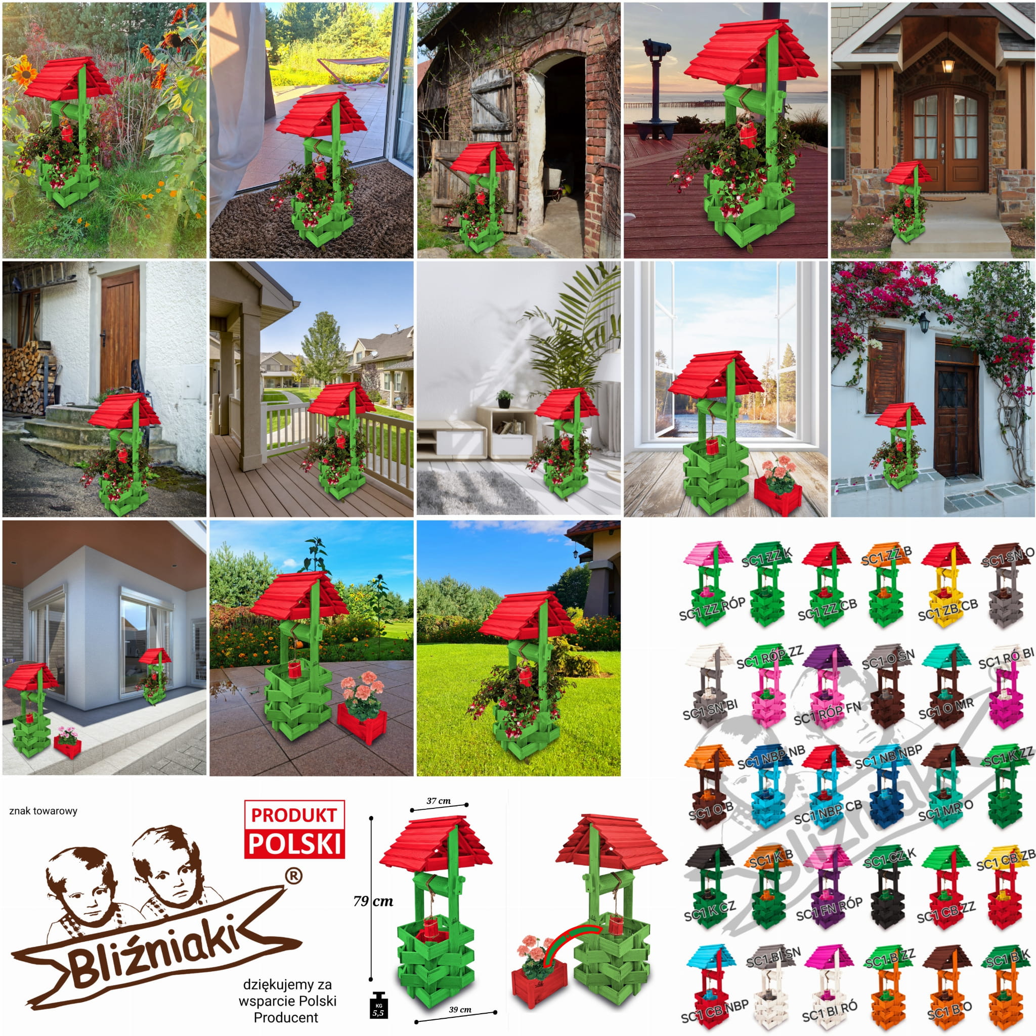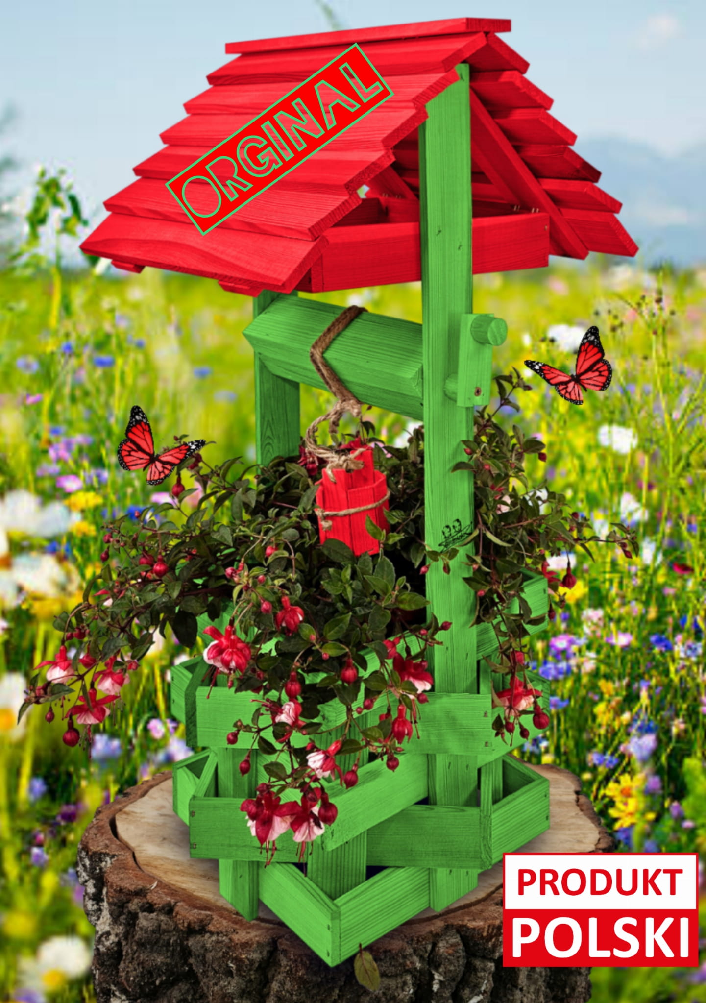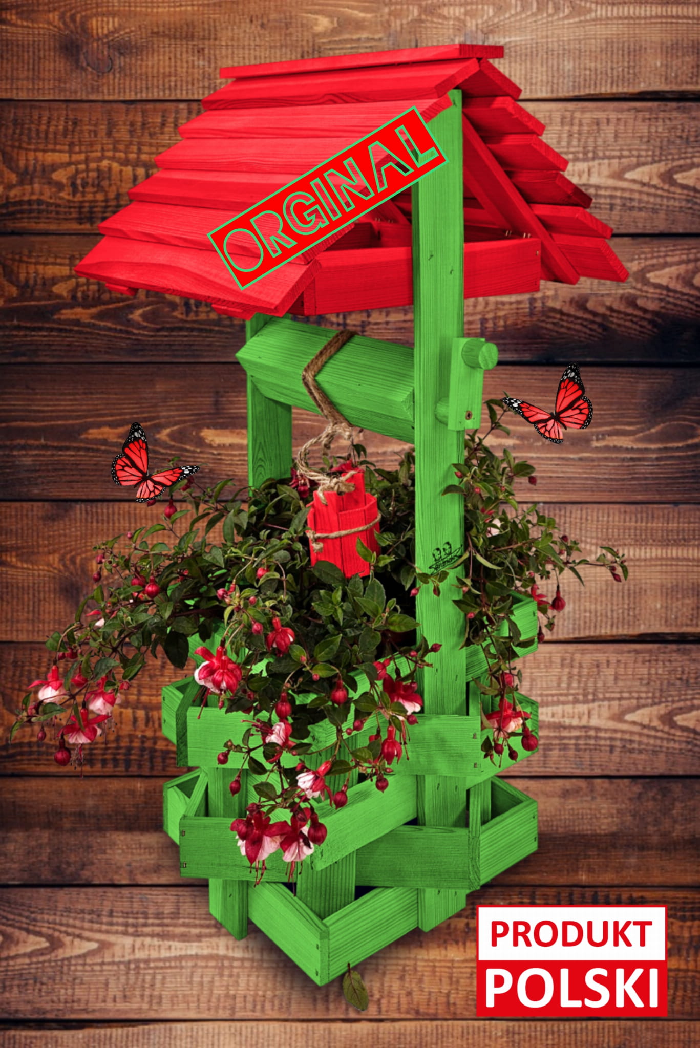 Wysoka studnia drewniana ozdobna Studzienka ogrodowa Prezent Ozdoba wnętrz i ogrodu Kwietnik kolor Czerwony Zielony Doniczka na kwiaty do domu i ogrodu Studzienka na pelargonie Studnie balkonowe tarasowe Studzienki ozdobne Doniczki SC1 ZZ CB