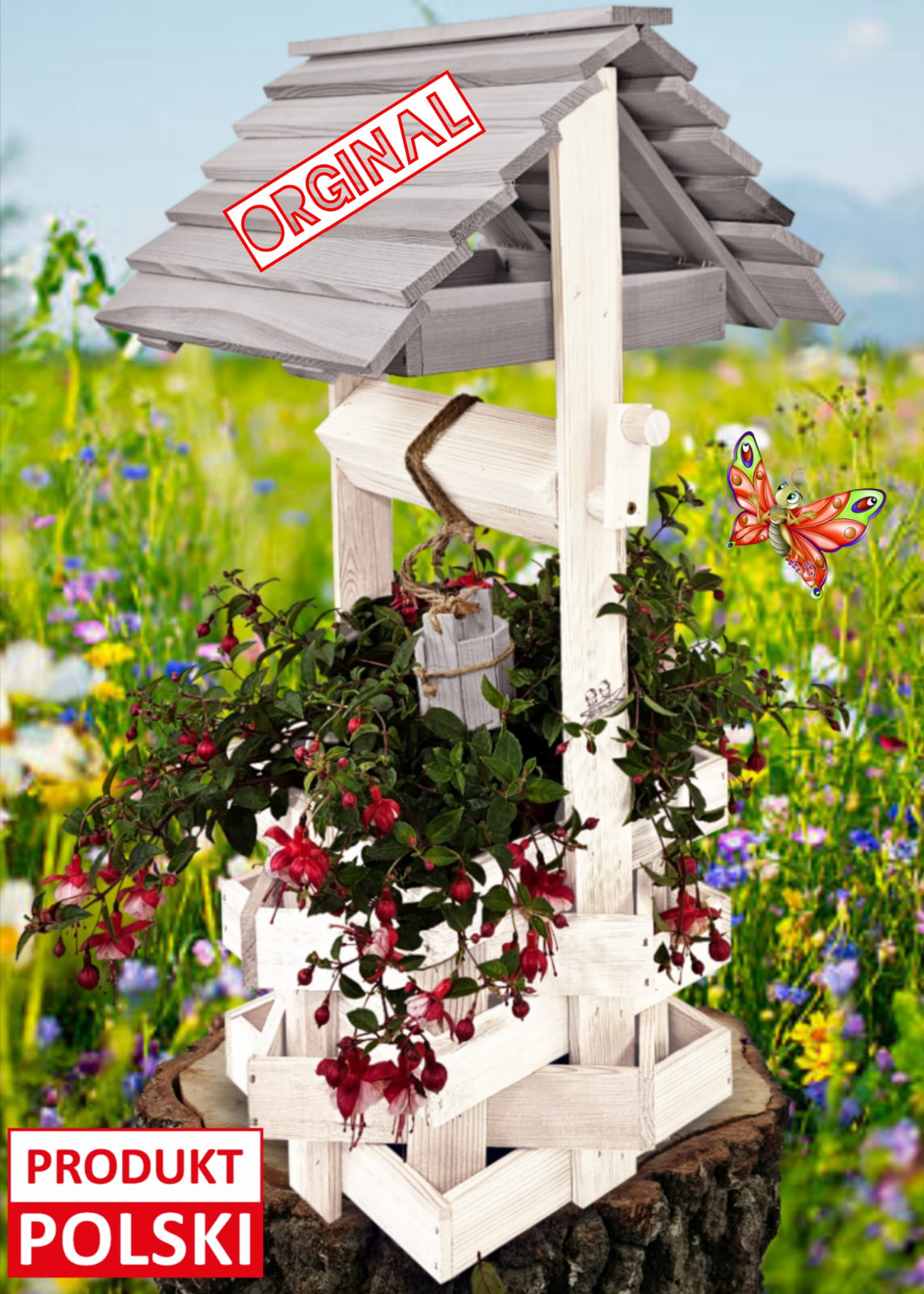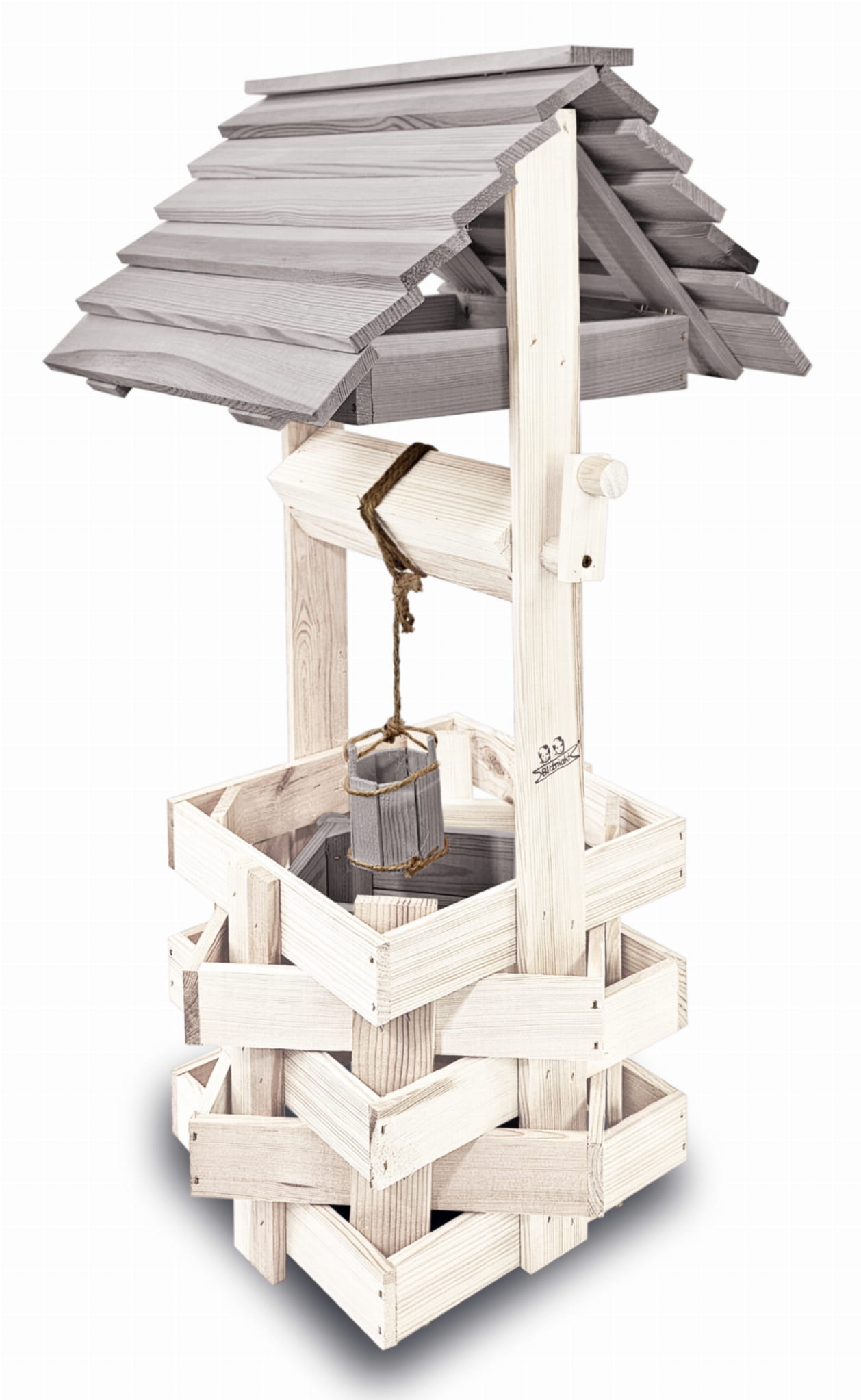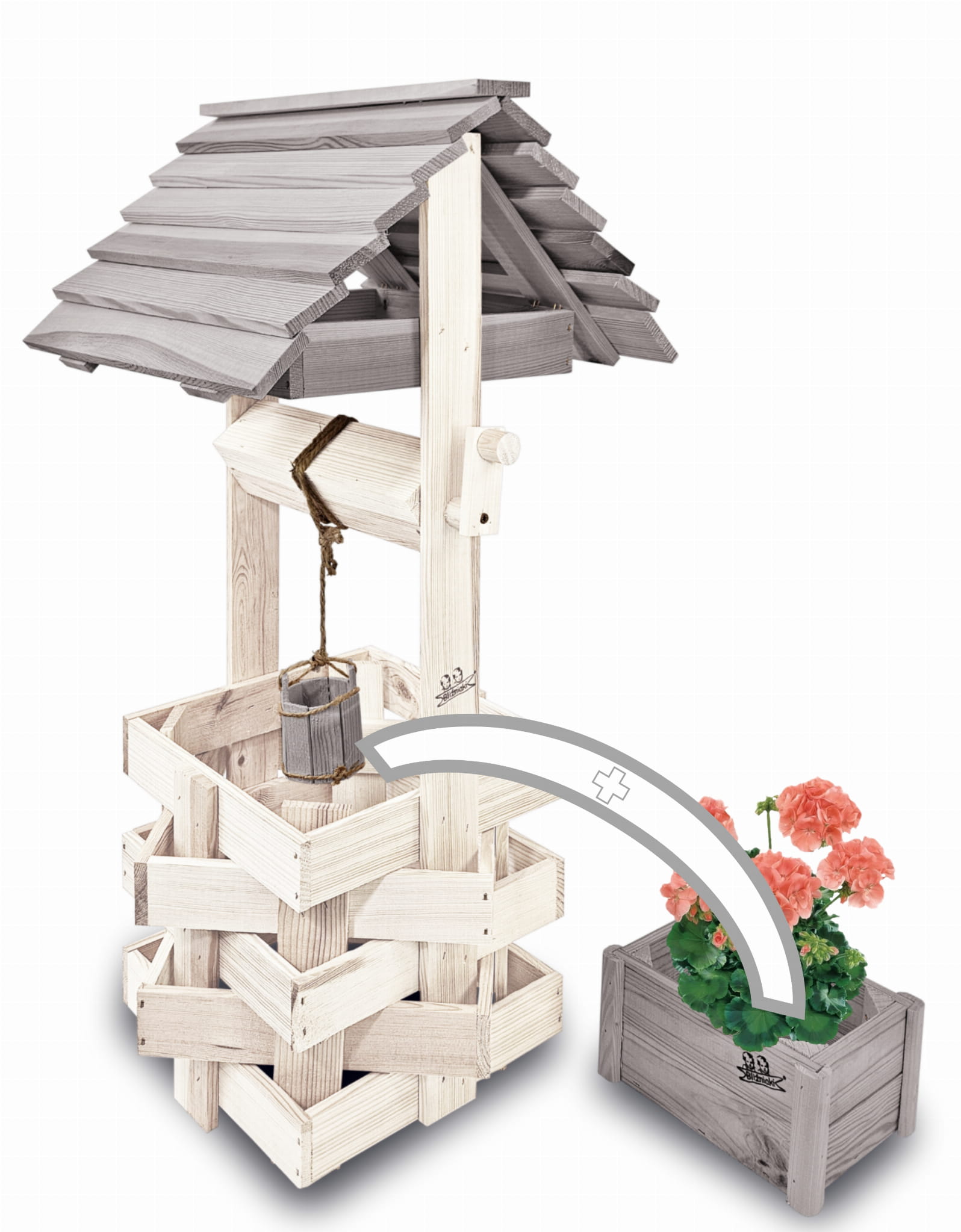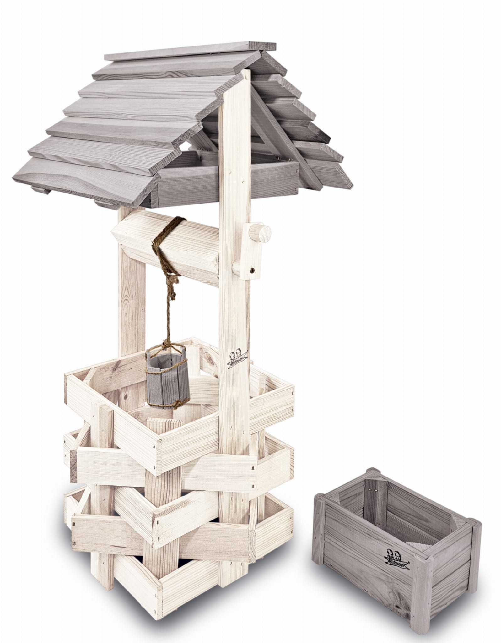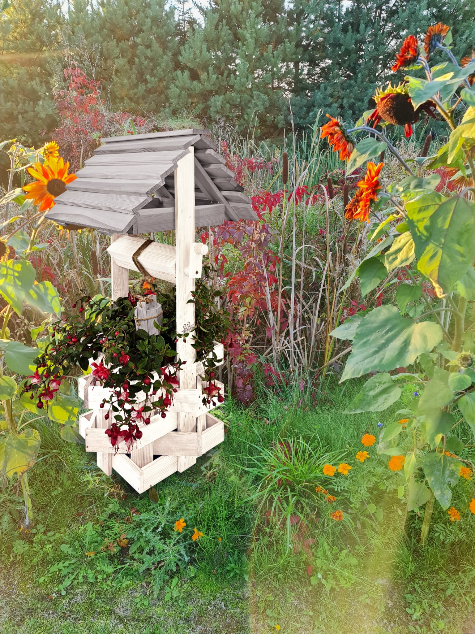 Do studni dołączona jest drewniana doniczka na kwiaty, utrzymana w tej samej estetyce, tworząc spójną i harmonijną całość.