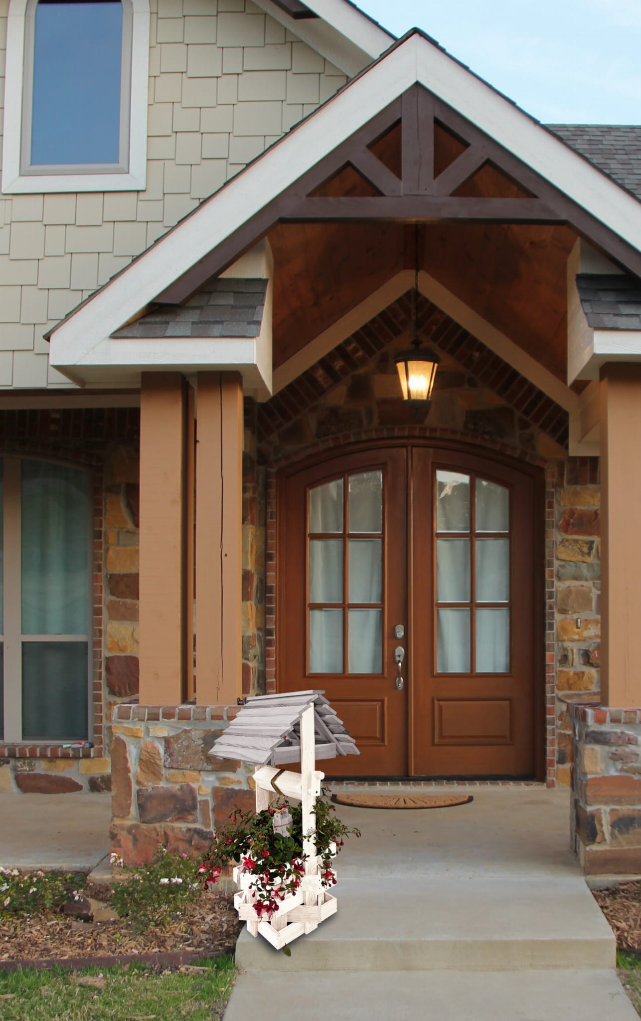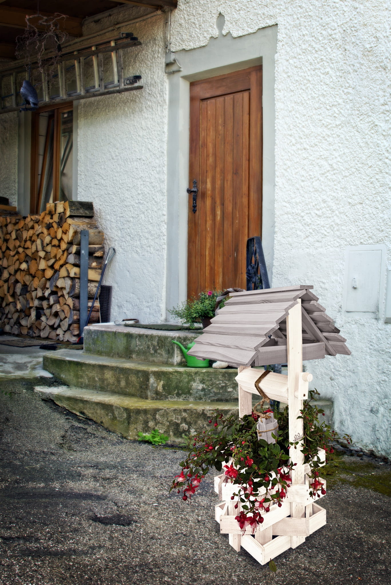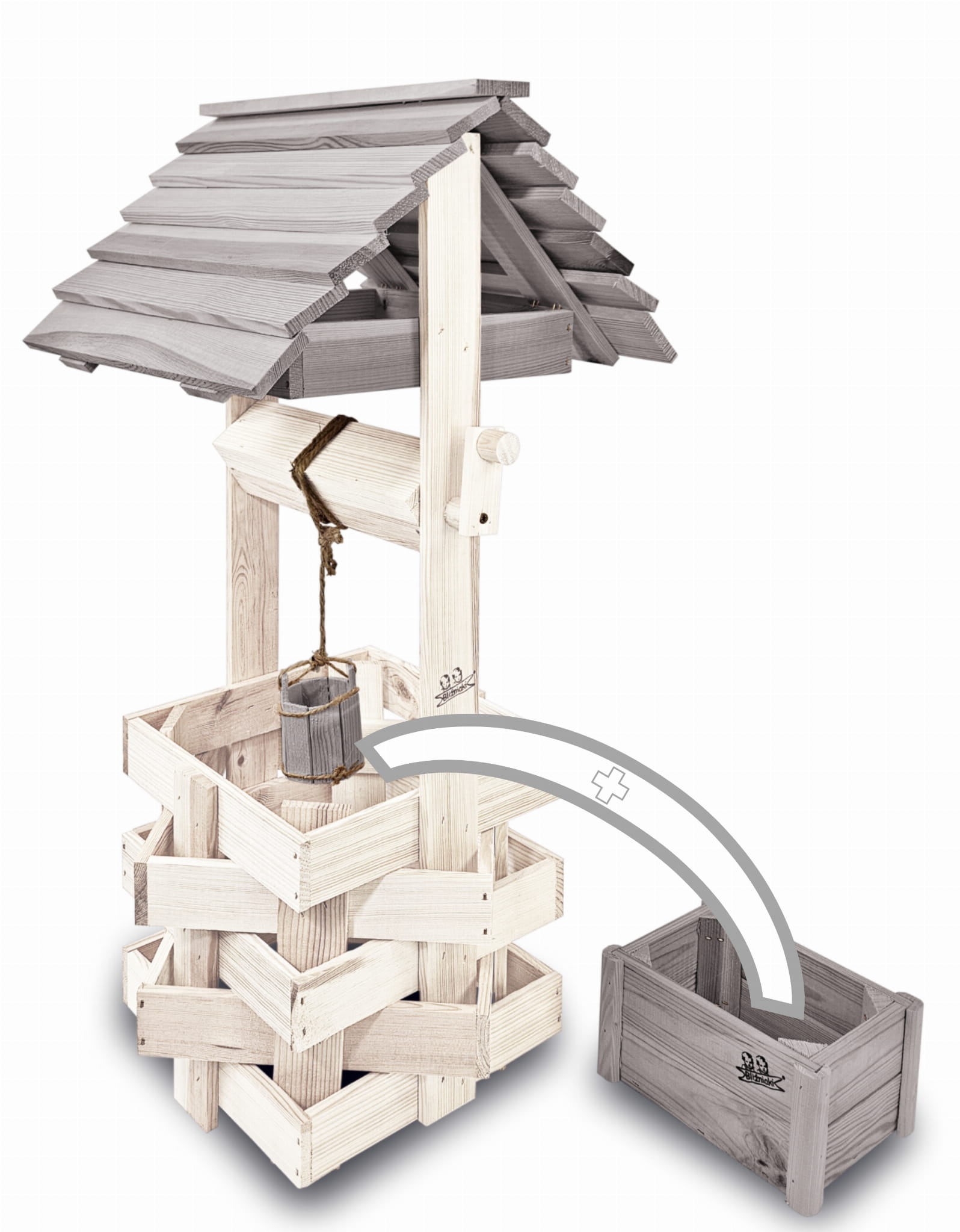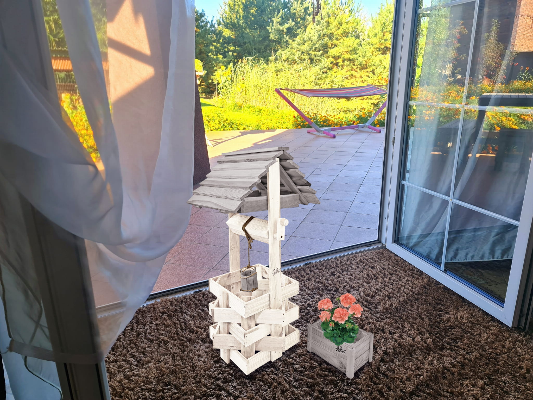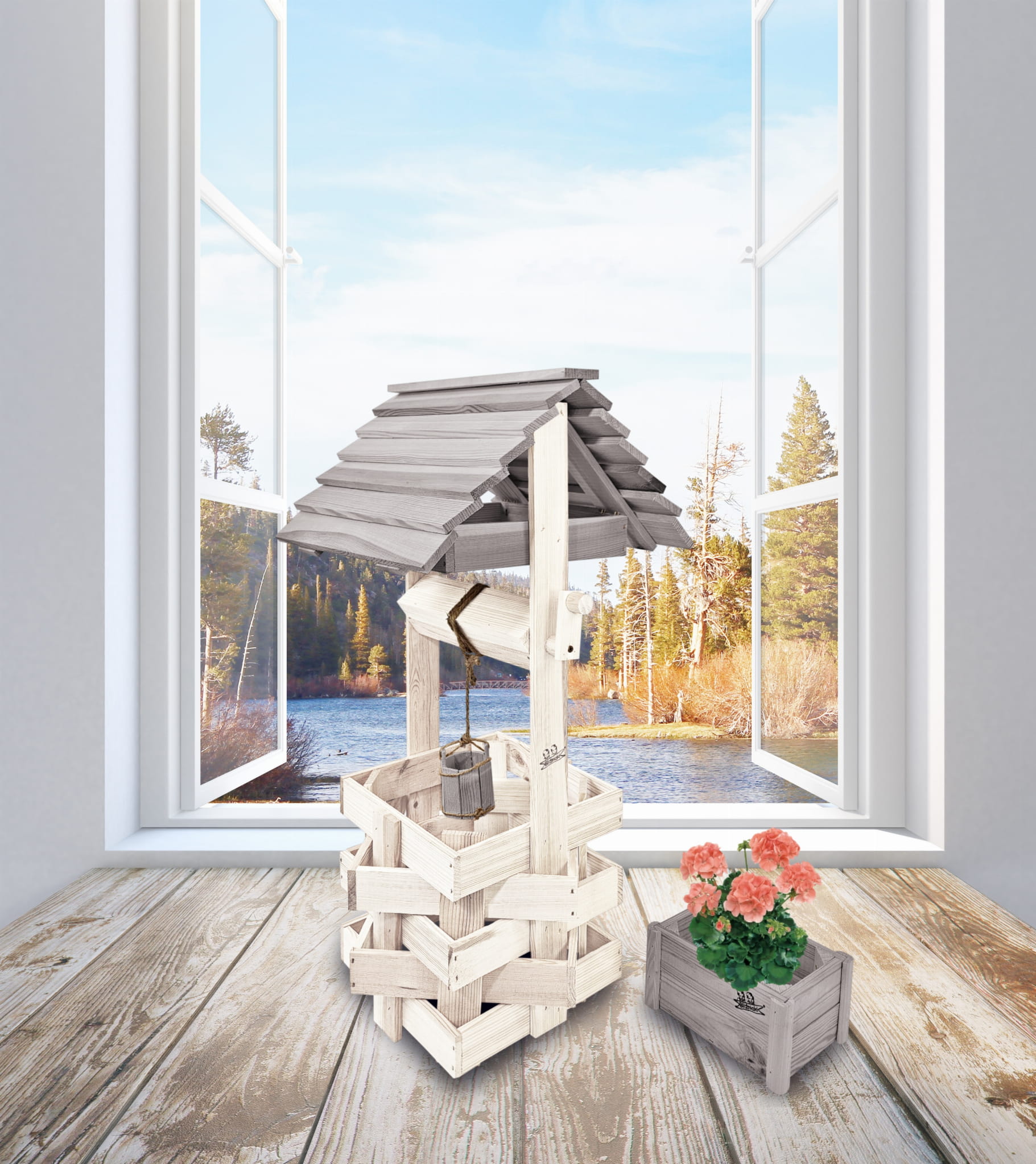 Do studni dołączona jest drewniana doniczka na kwiaty, utrzymana w tej samej estetyce, tworząc spójną i harmonijną całość.
