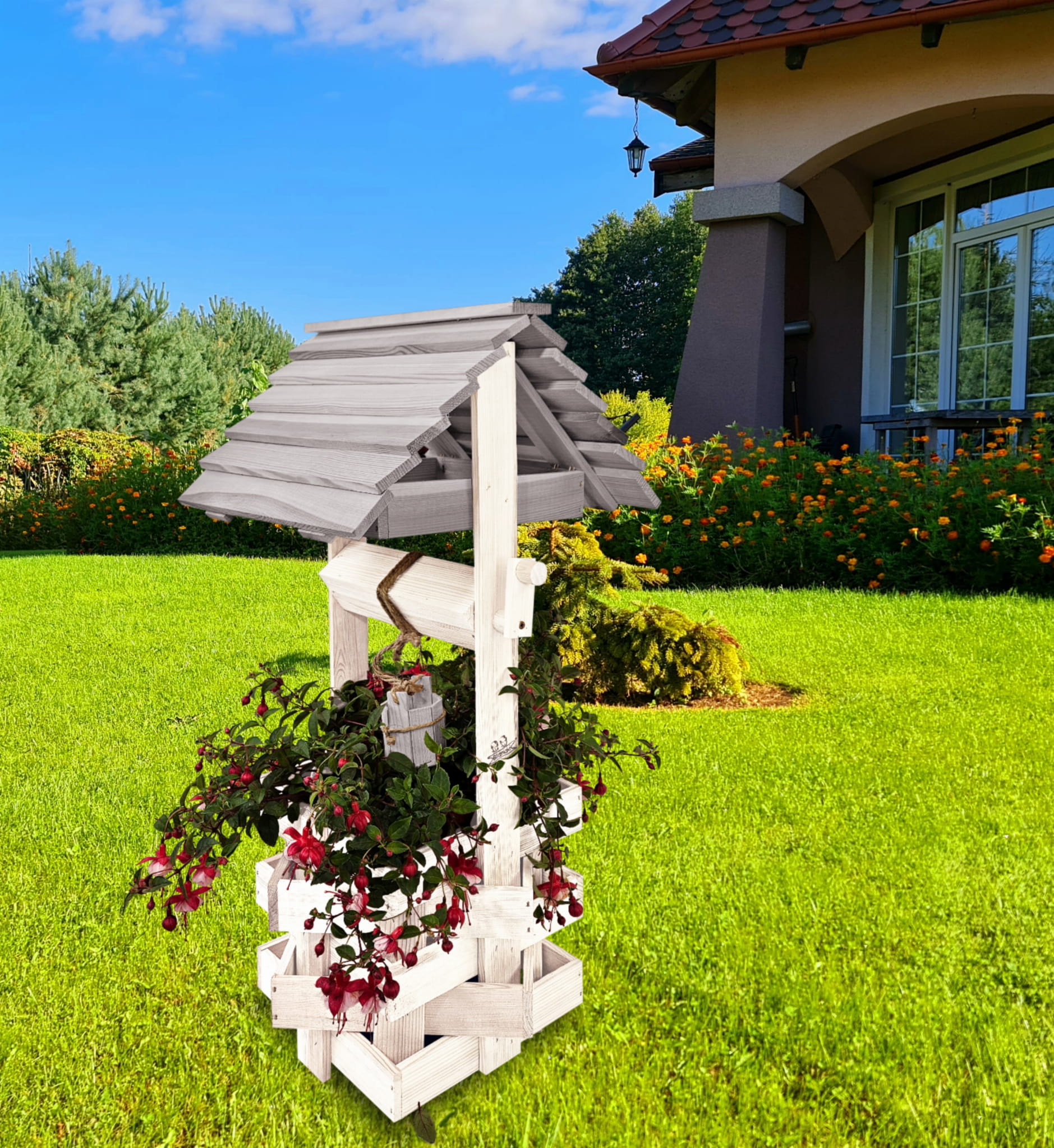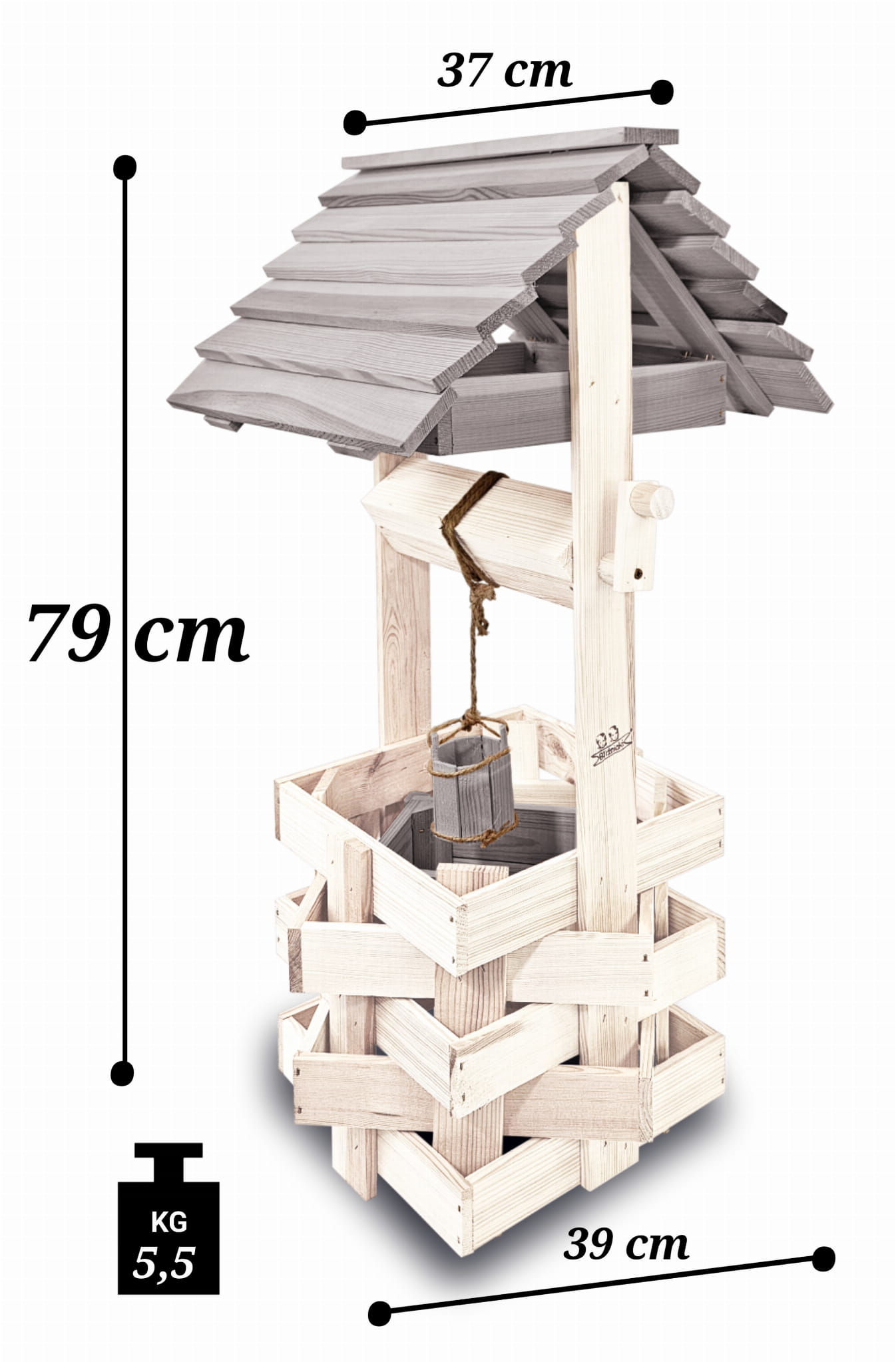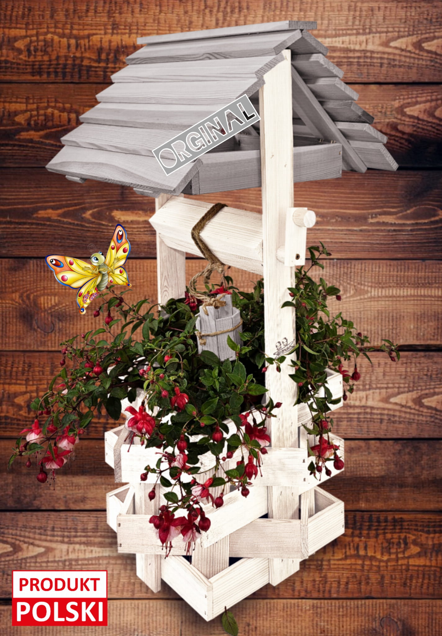 Wysoka studnia drewniana ozdobna Studzienka ogrodowa Prezent Ozdoba wnętrz i ogrodu Kwietnik kolor Jasny Szary Doniczka na kwiaty do domu i ogrodu Studzienka na pelargonie Studnie balkonowe tarasowe Studzienki ozdobne Doniczki SC1 BI SN
