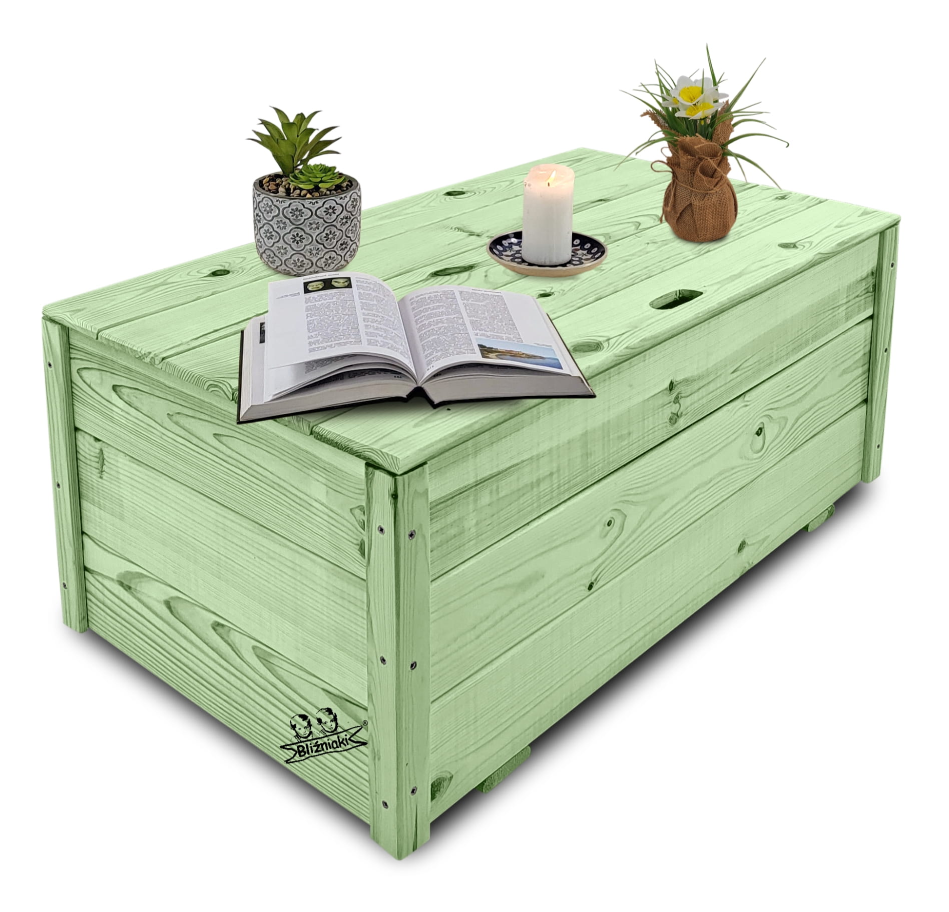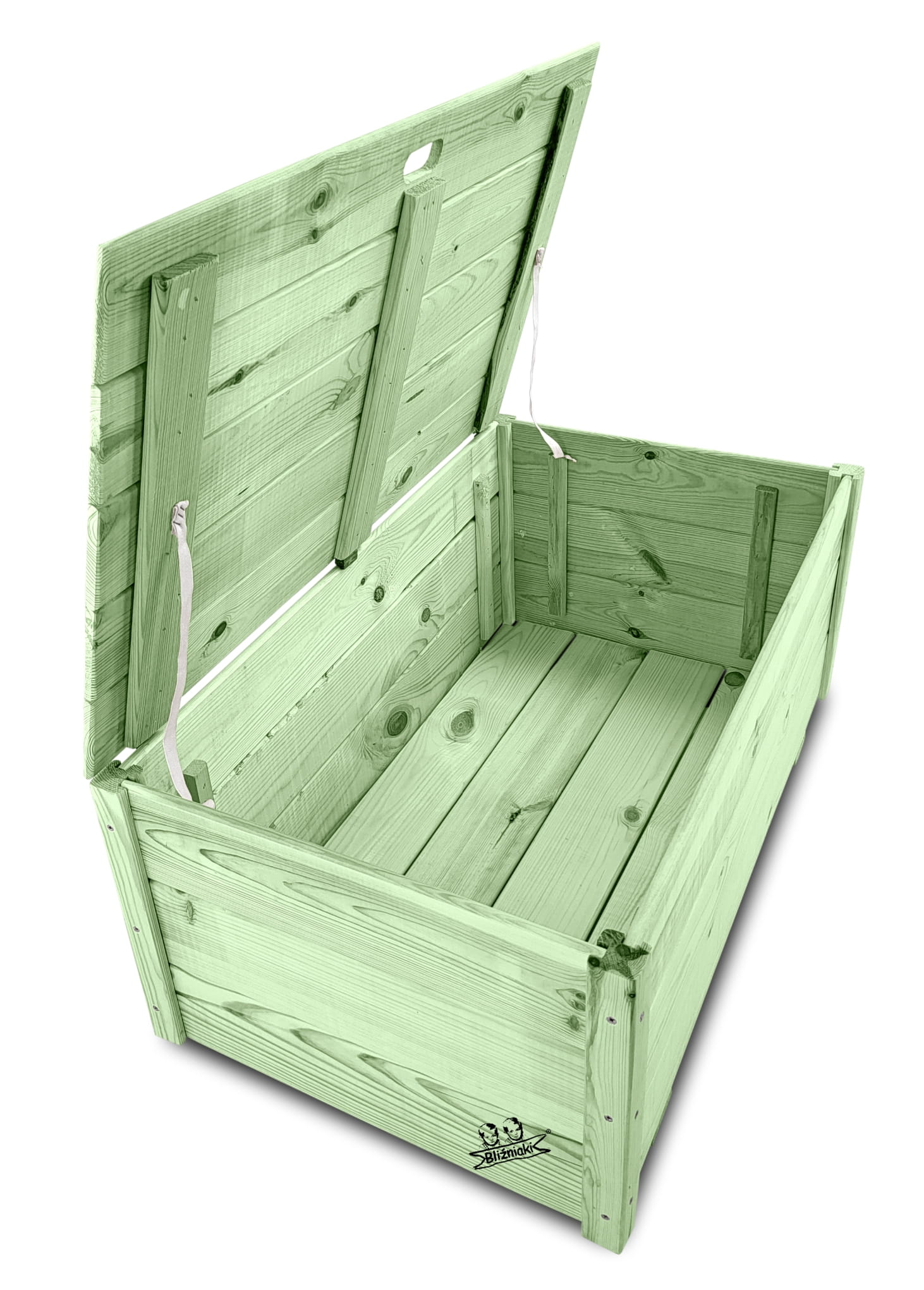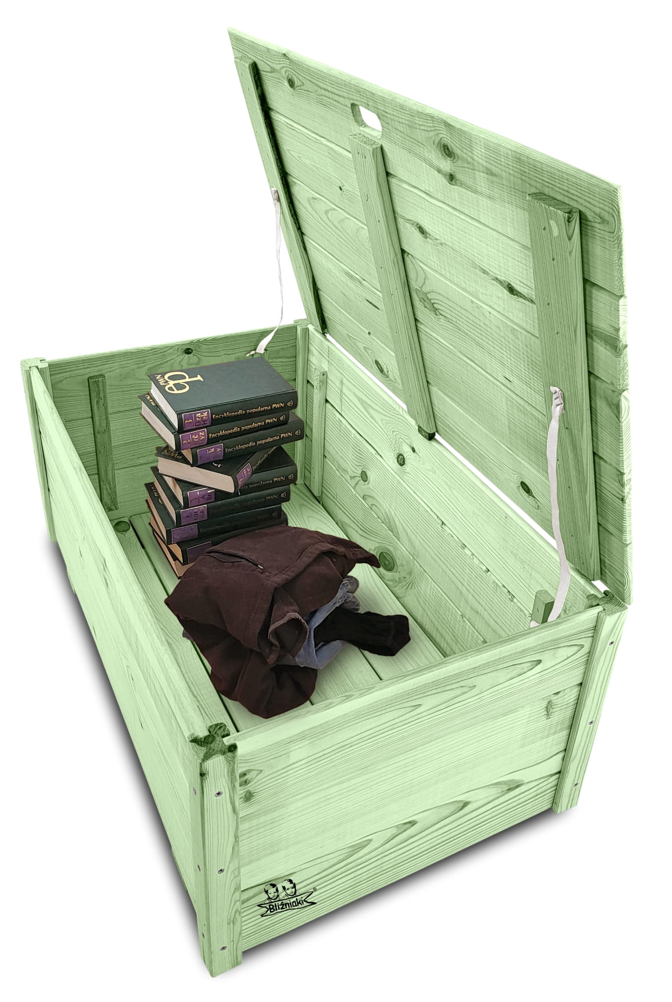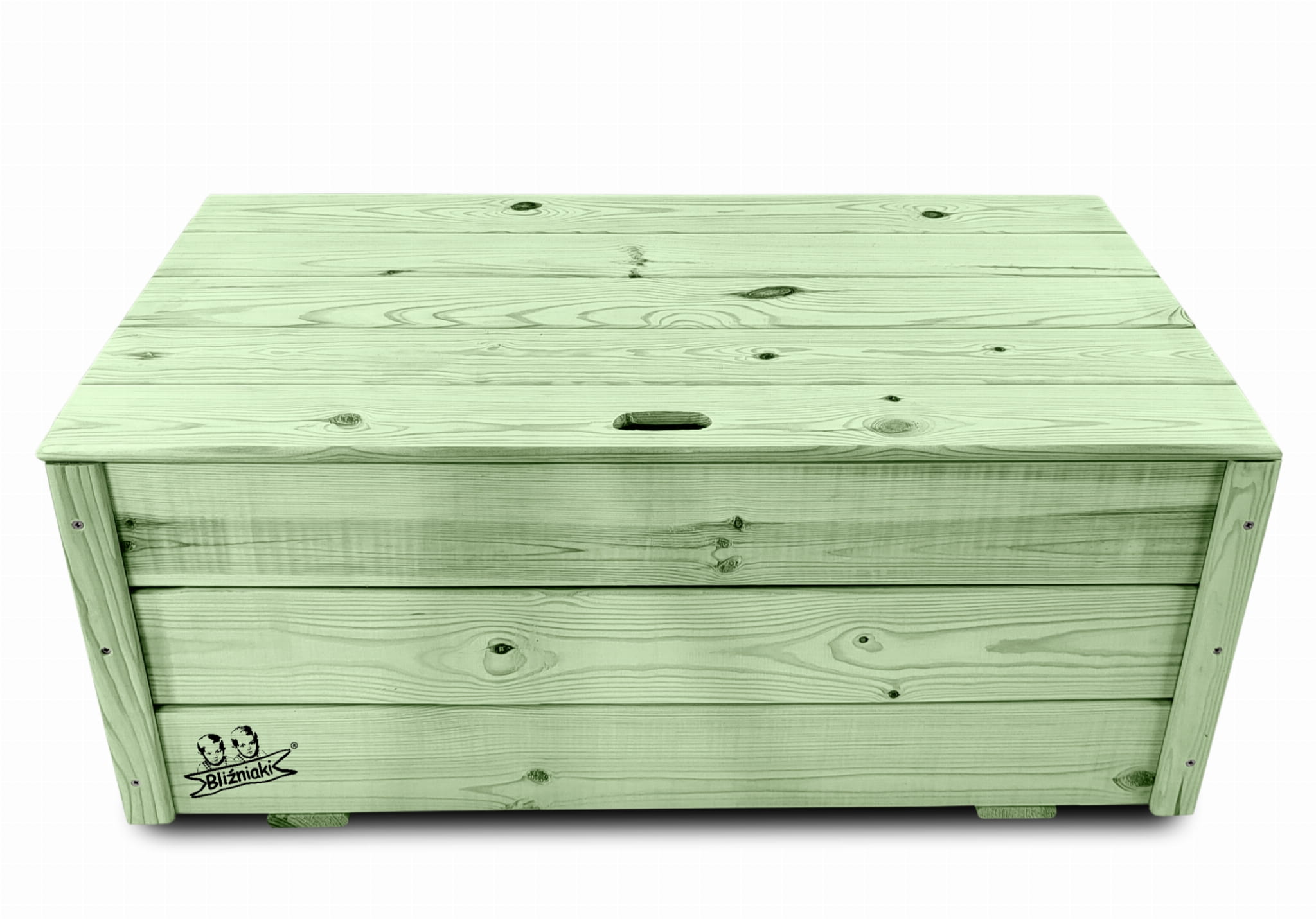 Produkt wykonany został z suszonego drewna sosnowego. Zabezpieczony metodą impregnowania. Środek na bazie wody użyty do impregnacji jest w pełni ekologiczny i bezpieczny dla ludzi i zwierząt. Zabezpieczone w taki sposób drewno sprawia, że skrzynia jest odporna na szkodliwe działanie wody oraz wilgoci, promieni UV, a także grzybów i pleśni, może być więc przechowywana przez cały rok na zewnątrz. Produkt w jednolitym kolorze PASTELOWYM JASNYM ZIELONYM.