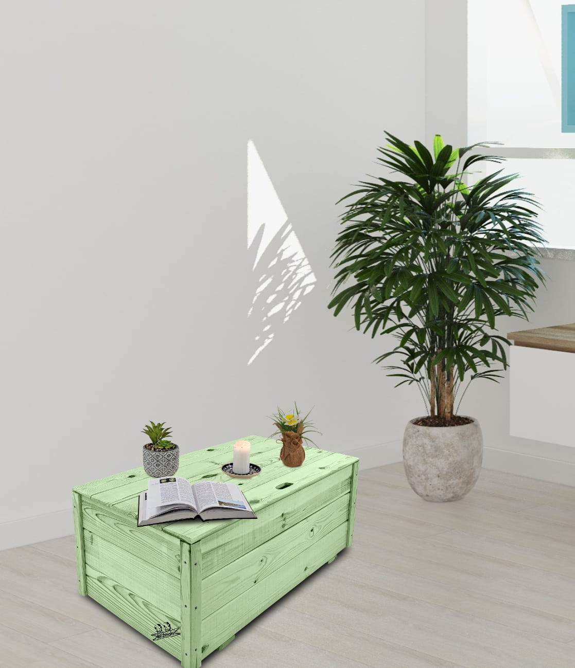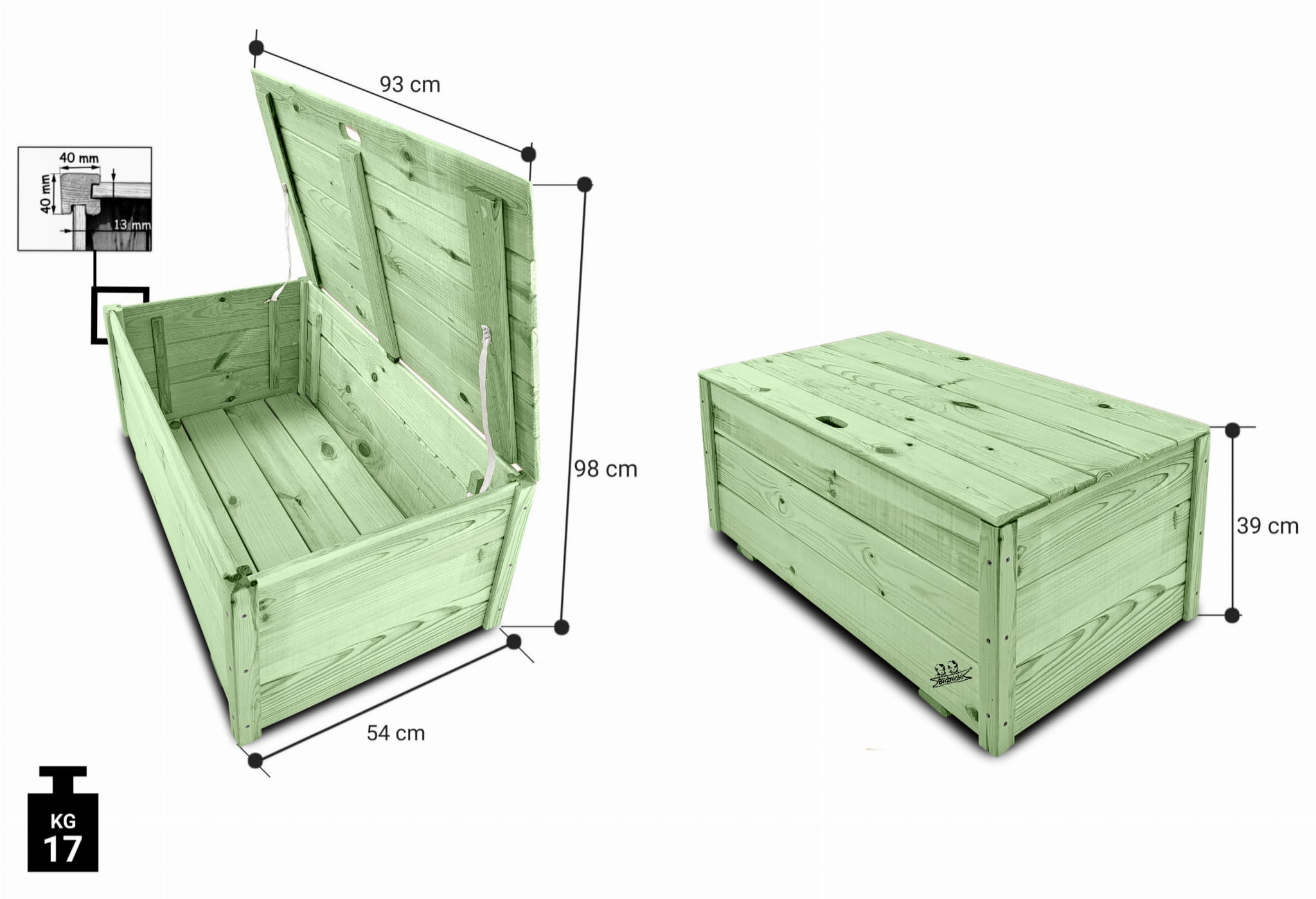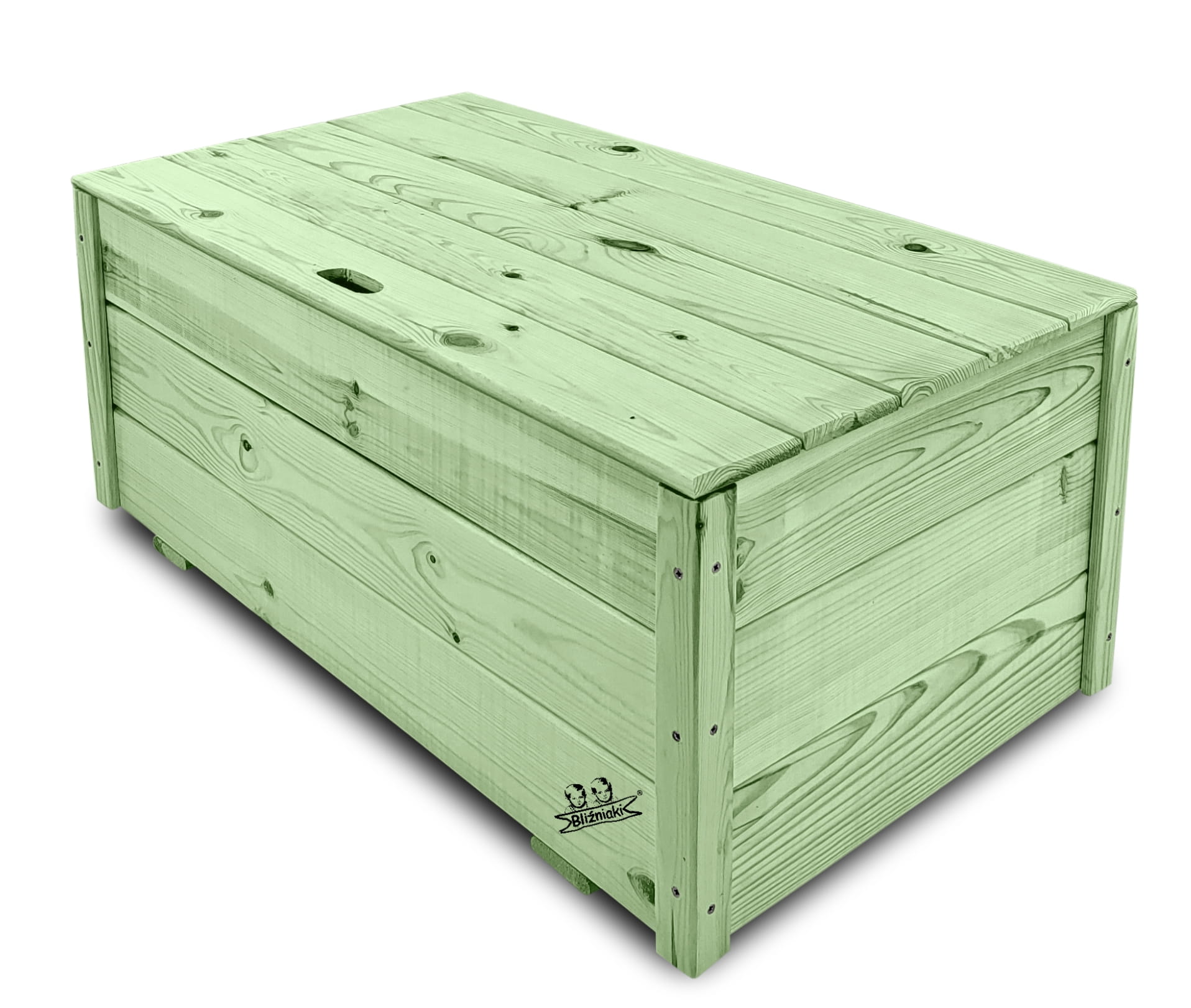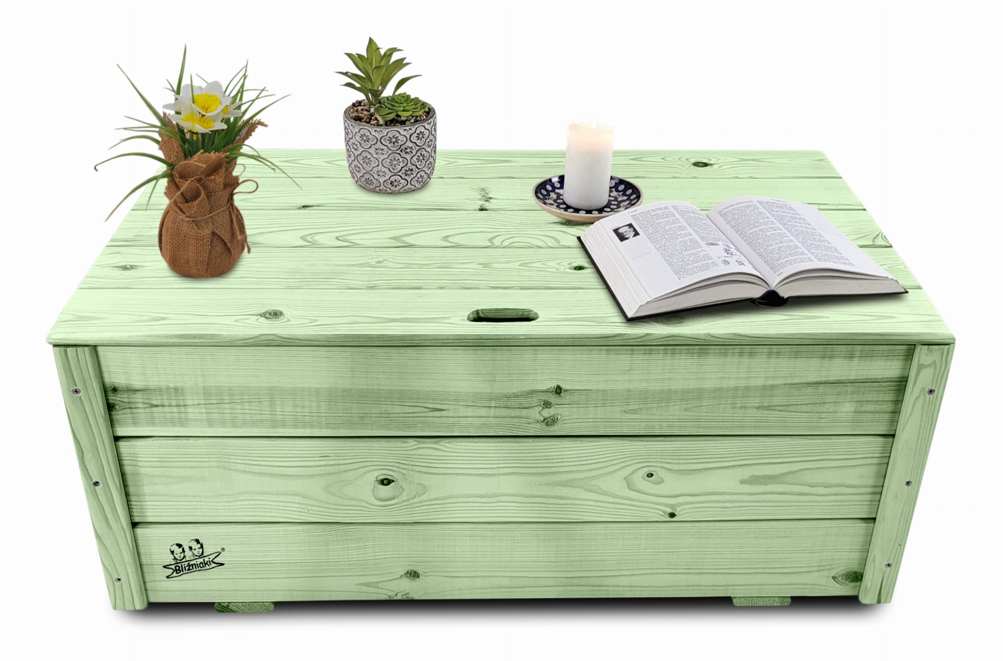 Produkt wykonany został z suszonego drewna sosnowego. Zabezpieczony metodą impregnowania. Środek na bazie wody użyty do impregnacji jest w pełni ekologiczny i bezpieczny dla ludzi i zwierząt. Zabezpieczone w taki sposób drewno sprawia, że skrzynia jest odporna na szkodliwe działanie wody oraz wilgoci, promieni UV, a także grzybów i pleśni, może być więc przechowywana przez cały rok na zewnątrz. Produkt w jednolitym kolorze PASTELOWYM JASNYM ZIELONYM.